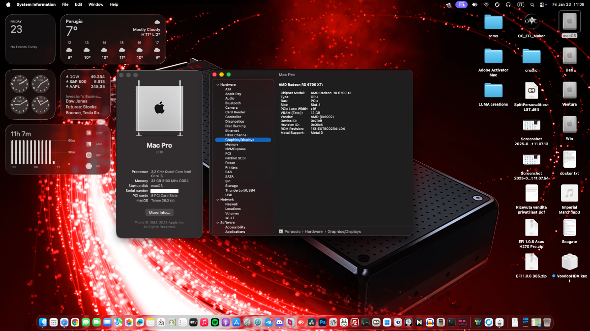 Visti i miei recenti upgrades alla mia build AMD ammiraglia, incompatibili con macOS, sentendo troppo la mancanza di Logic, ho smantellato la mia build fatta con pezzi da recupero Poraccio, basata su una mobo B85 con le porte SATA malfunzionanti, e mi sono procurato da un dumpster dive il seguente hardware: ASUS Prime H270 Pro Intel Core i5 6500 3.2 GHz quad core 32Gb RAM DDR4 Dual channel AMD Radeon RX 6700XT 12 Gb SSD OWC Aura Pro x2 1Tb originale MacPro con adattatore PCIex HDD 10 Tb Sata Hitachi Dopo aver modificato la EFI opportunamente ora ho Tahoe funzionante accanto al mio pc principale, pronto per produrre all'occorrenza. Ero scettico sul funzionamento della 6700XT con NootRX ma mi sta stupendo, non sto trovando glitch o mancanze ad ora e la annovererei tranquillamente tra le GPU supportate e pure discretamente performanti! Ora, ci starebbe proprio bene un i7 7700k, ma chissà per quale motivo costano ancora UN RENE. Qualche anima pia qui che ne vende uno a prezzi UMANI? Poraccio LIVES, AGAIN and AGAIN!