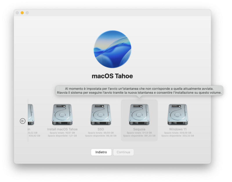 A proposito di stranezze dovute a boot da dischi/EFI differenti - con alcuni che vanno e altri no - seppur "uguali" ... M'è capitato pure questo. Avevo 2 istantanee differenti nel volume di Sequoia (ovviamente non accessibili ne rimovibili con Utility Disco) come causa di mancate corrispondenze e avvii. Cosa che mi si è resa nota solo reinstallando Tahoe (full) da Sequoia, altrimenti avevo voglia a cercare! Suppongo che la causa sia il backup automatico di Time Machine che imperterrito salva istantanee di tentativi infruttuosi da me effettuati, sommando disastro a disastro. Disabilitando TM e un paio di riavvii di sicurezza e le istantanee sono sparite. ... ma va bene così!