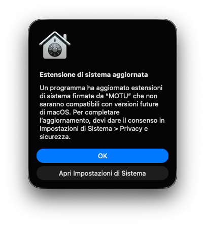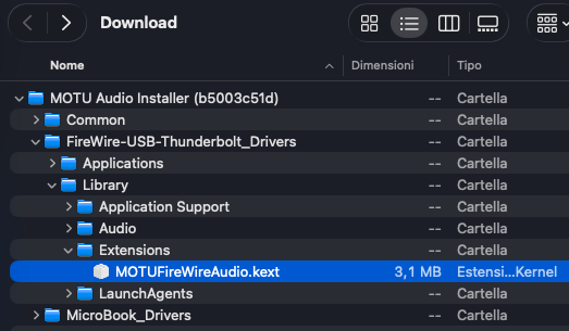 Riproverei con i driver ufficiali https://motu.com/en-us/download/product/273/#2717 Presta attenzione al pop up " Estensione di sistema " .... Il kext che usa e' MOTUFireWireAudio.kext , ( l ho estrapolato dal PKG ) e l ho installa in /Library/Extensions Ho provato a inserirlo manualmete via terminale sudo cp -R ... e subito dopo mostra il pop up per dare il consenso