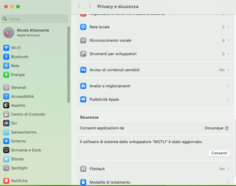 No, la scheda funziona...prima ho provato in Windows viene vista e si sente...quindi dovrei disinstallare il tutto e riprovare? Perchè quando installo il kext e dopo i driver non mi apre e non c'e' nulla in Privacy e sicurezza, premetto che ho disabilitato il SIP e Gatekeeper Ho ritrovato una vecchia discussione su altro forume diceva così: Ventura doesn't have the Firewire Core Audio extension. I was able to get it to work on mine with a hack. It's a little bit tricky, you need to either disable SIP or allow unsigned kexts with a csr-active-config value of <01>, then you need to manually load a modified version of the Firewire audio kext from Monterey. Attached is the kext, you can just put it in your home directory and then load it from the terminal with: sudo kmutil load -p AppleFWAudio.kext I made a login script to automatically load it on mine. First time you load it you will have to give it permission in privacy settings. Also it made my Firewire audio interface ask for permission to use the camera even though there is no camera. Lol. BTW installing it into the system extensions or injecting it with Opencore doesn't work. Manually loading after login is the only way I was able to get this to work.