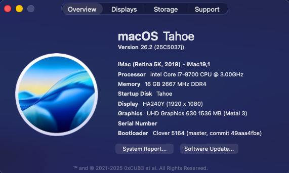 13. Ho dato un occhio al tuo config.plist e vedo che WEG è ancora alla versione 1.7.0, inoltre vedo che vai con l'integrata, non hai un'altra scheda a disposizione? Nel mio caso ho installato Tahoe eliminando USBmap e cambiando SMBIOS, ho messo MacPro 7.1 invece dell'originale iMac 20.1, anche a me si spegneva il monitor però non avevo riavvii