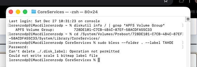 COSI' sudo bless --folder . --label TAHOE TAHOE senza le virgolette altrimenti alla gui lo mostra cosi ---TAHOE--- Stessa cosa poi qui printf TAHOE | sudo tee .disk_label.contentDetails; echo sudo chgrp wheel .disk*