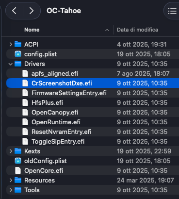 il driver l hai dichiarato anche nel plist 🤔 ? Icone Rinomina quella per Tahoe -> Apple26.icns Rinomina quella per Sequoia -> Apple15.icns Rinomina quella per Sonoma -> Apple14.icns Rinomina quella per Ventura -> Apple13.icns ............
