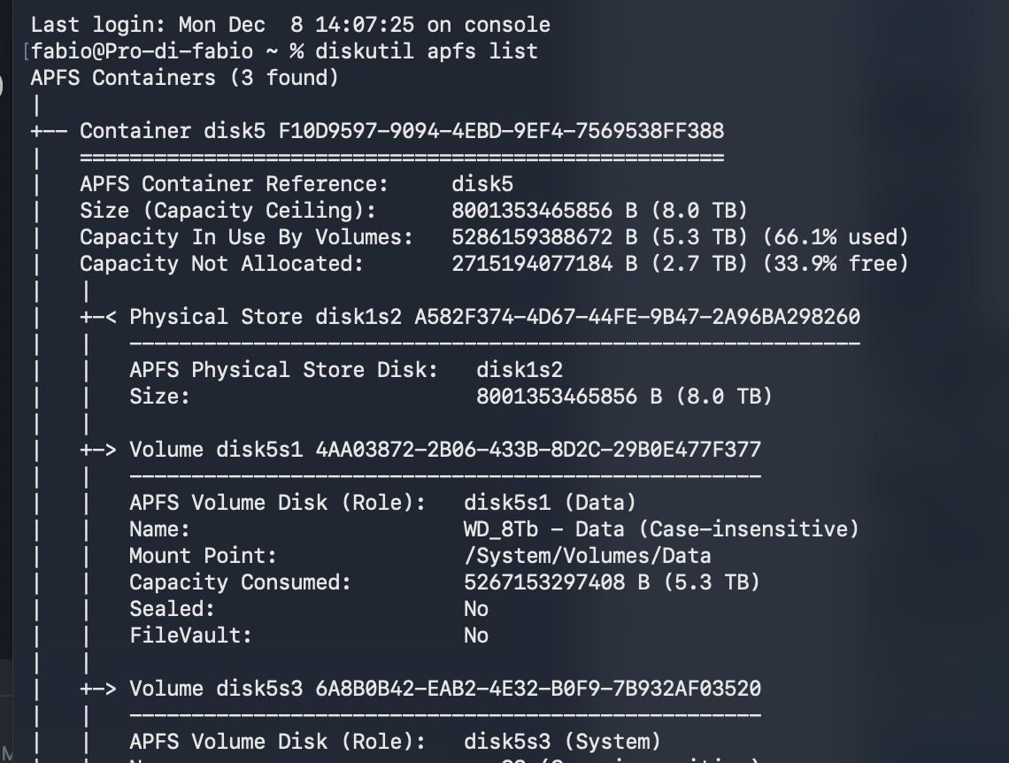 list (Show status of all current APFS Containers) listUsers (List cryptographic users/keys of an APFS Volume) listSnapshots (List APFS Snapshots in a mounted APFS Volume) listVolumeGroups (List all current APFS Volume Group relationships) convert (Nondestructively convert from HFS to APFS) create (Create a new APFS Container with one APFS Volume) createContainer (Create a new empty APFS Container) deleteContainer (Delete an APFS Container and free or reformat disks) resizeContainer (Resize an APFS Container and its disk space usage) addVolume (Export a new APFS Volume from an APFS Container) deleteVolume (Remove an APFS Volume from its APFS Container) deleteVolumeGroup (Remove grouped APFS Volumes from its APFS Container) eraseVolume (Erase contents of, but keep, an APFS Volume) changeVolumeRole (Change the Role metadata flags of an APFS Volume) unlockVolume (Unlock an encrypted APFS Volume which is locked) lockVolume (Lock an encrypted APFS Volume (diskutil unmount)) changePassphrase (Change the passphrase of a cryptographic user) setPassphraseHint (Set or clear passphrase hint of a cryptographic user) encryptVolume (Enable FileVault security in background or instantly) decryptVolume (Disable FileVault security in background or instantly) deleteSnapshot (Remove an APFS Snapshot from an APFS Volume) defragment (Arm or check status or begin APFS defragmentation) updatePreboot (Update a macOS Volume's related APFS Preboot Volume) syncPatchUsers (Copy Volume Group crypto users System-to-Data role) diskutil apfs <verb> with no options will provide help on that verb