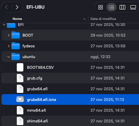 Grazie anche a te Per quanto riguarda rinominare il disco Sequoia -> Tahoe puoi seguire qui https://macos86.it/topic/6589-rinominare-disco-in-macos-sonoma-sequoia-tahoe/#comment-145055 Per Regata , prova a copiare l icona nella EFI di Regata appunto , non ricordo il loader che usa ma credo Grub e rinominala in grubx64.efi.icns ( nell esempio e' la mia EFI ubuntu , la tua sara' Regata ) Per i 2 Win Dovresti trovare tramite Shell le corispettive EFI e aggiungere il percorso nelle Entries e customizzarle a piacere Per la usb non sono riuscito a trovare info dettagliate riguardo al chipset , ma mi pare di capire sia Realtek ... non compatibile