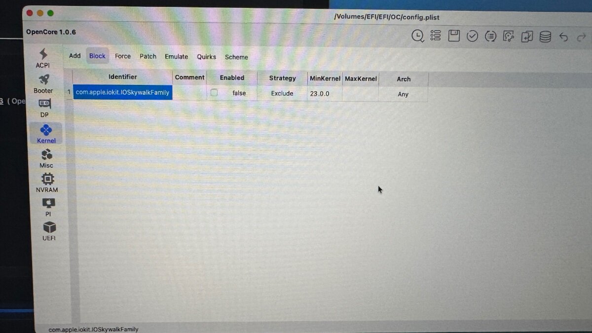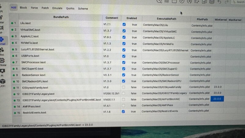 @Giaccazse spunti quelli che hai in kernel add, devi spuntare anche questo che blocca il kext base del sistema nuovo in kernel add si aggiungono kext vecchi che con OCLP aiutano il wifi a funzionare Da questa foto attivi il blocco del kext nuovo presente nel sistema