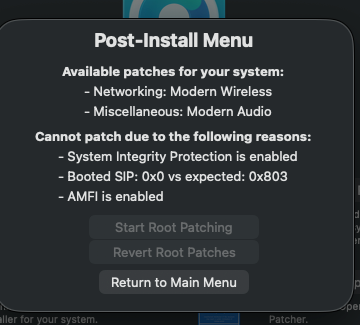 l hai messo questo in boot-args si amfi=0x80 controlla con hackintool in nvram cosa mostra ... Amfi e' ancora attiva non puo' patchare ... resetta nvram