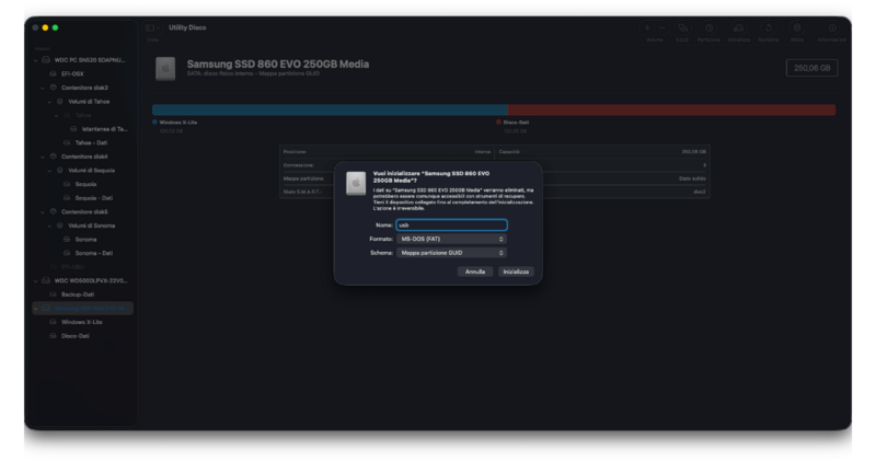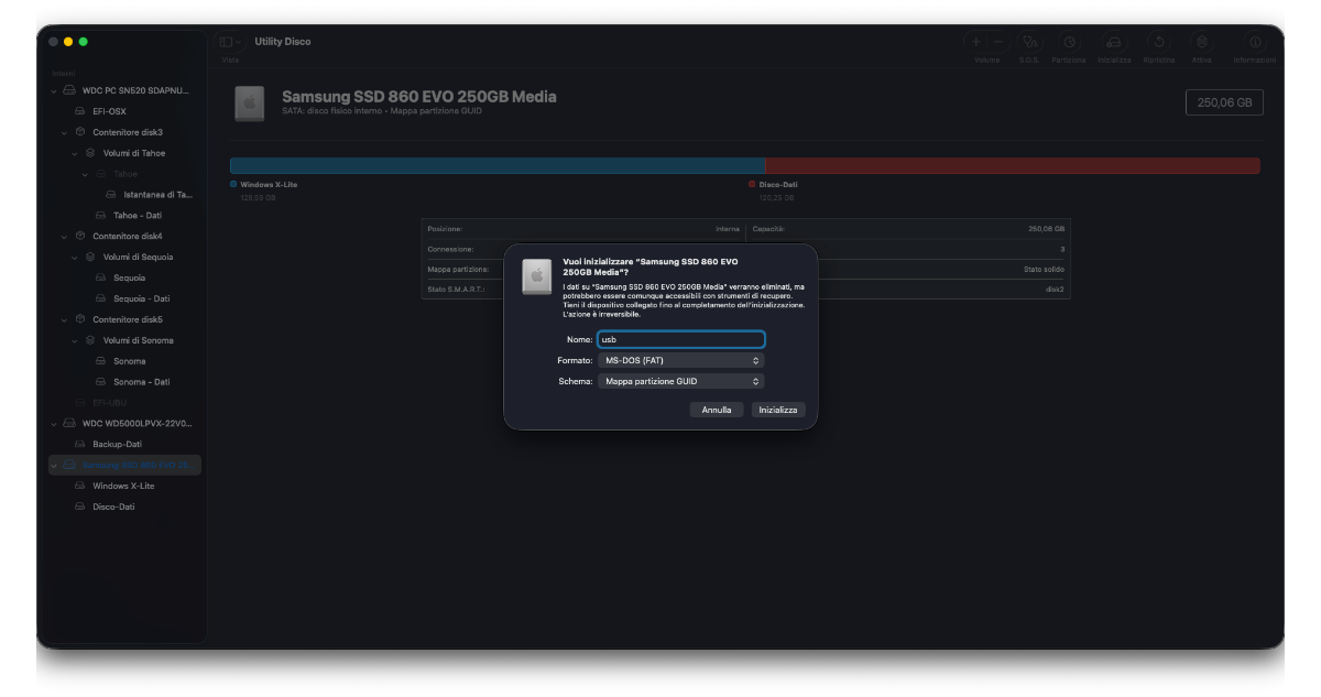 2. Non riavviare , hai disattivato il filevault ? apri il terminale e incolla questo diskutil apfs list ... poi se non vuoi Tahoe ( oltre alle usb non va neanche la audio ... ce' d apportare modifiche ) Basta che invece di avviare l icona tahoe devi avviare la recovery di tahoe .... ma prima bisogna che finisce di decryptare il disco ! Sperando sempre che TM funzioni Formatta una usb in ms-dos e copiaci la cartella EFI dentro ... cosi hai un punto di partenza in caso di mancato avvio