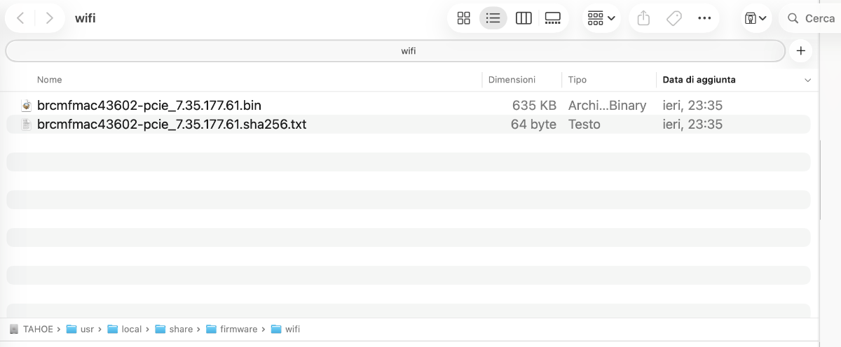 "un tentativo lo fareI " non vuol dire che a priori non funziona , ci potrebbero essere altre problematiche ... da verificare " ho fatto tutto " VT-D nel bios va abilitato OCLP non va usato essendo che carica un firmware suo nativo , anzi va fatto il revert , vanno disabilitati tutti i kexts inerenti a OCLP block compreso nel Kernel Sip va impostata di default 00000000 Va creata la cartella " wifi " in /usr/local/share/firmware/ e va copiato il firmware al suo interno + brcmfmac43602-pcie_7.35.177.61.sha256.txt Va aggiunto il kext AppleBCMWLANCompanion Va aggiunto il boot-arg wlan.pcie.detectsabotage=0 Va iniettatta la periferica in Device Properties ... Devi disabilitare SSDT-Disable_Network_RP03.aml ( OC-Smplify l ha disabilitata ( scheda Wi-fi ) essendo nn compatibile in Tahoe ) Reboot and Enjoy