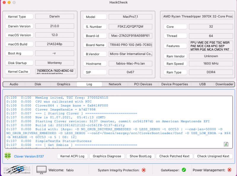 Added on 01-08-2021 AMD Clover Vanilla patches Github: https://github.com/AMD-OSX/AMD_Vanilla/tree/clover I have converted only patches mandatory for my chipset and cpu.. you can follow the same schema in nomenclature definitions By the way ,some definitions in clover 5137 are not described well and I think must be update their nomenclature Also MAtchOs need some check and I hope devs will solve a very annoying bug for AMD users 🙂 MAtchOS is not perfect by now in my definition of this plist..but was useful to boot with a clean and also to update from 11.5 beta 4 I used the attached patch plist to install from scratch and then to update Only GoldFish64 patch has some definition problem in CLoverBootloader due Empty Find value (in verbose it prints out a not destructive error) I have also attached two debug log to see problem I have said before and also others job to do. 1)installation debug (GetOS Empty all patches applied.....😇 2) after installation is completed....GetOS detection works as it must do Thanks to patches-manager and creator 🙂 debug_pre inst_inst.zip opencore-2021-07-01-161751.txt.zip for lryzen friend (17h19h) pay attention on patch 43..I commented limit there 😉 thanks @iGPUfor Goldfish64 2F tip! 😉 ------ UPDATE 18-07-2021 https://www.macos86.it/topic/4913-amd-clover-bootloader-monterey-beta-1-installation-patches/?do=findComment&comment=116586 Clover-Kernel_Patches_Quirks.plist.zip1 point