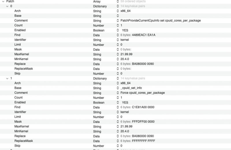 new patch algrey - Force cpuid_cores_per_package: Below I hope an useful schema taken from Shaneee Opencore PR COMMENT: algrey - Force cpuid_cores_per_package FIND: c1 e8 1a 00 00 00 MASK : FF FD FF 00 00 00 BASE: _cpuid_set_info COUNT: 1 REPLACE high sierra to mojave: b8 XX 00 00 00 00 REPLACE from catalina to big sur : ba XX 00 00 00 00 REPLACE MASK high sierra to big sur : FF FF FF FF FF 00 REPLACE monterey : ba XX 00 00 00 90 REPLACE MASK monterey : FF FF FF FF FF FF 3970x --->32 cores XX=20 3960x--->24 cores XX=18 3950x--->18 cores XX=10 and so on 🙂 so for all system from high Sierra you have three different patches (common find and mask) different replace and replace mask minKernel and maxKernel do the jobs to enable proper ones for OS you use I am using an old patch posted on @jsl2000config.plist which works in BIG SUR and all Monterey Beta But latest PR uses above patching 😉1 point