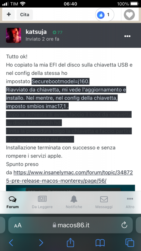 Tutto ok! Ho copiato la mia EFI del disco sulla chiavetta USB e nel config della stessa ho impostato Securebootmodel=j160. Riavviato da chiavetta, mi vede l'aggiornamento e installo. Nel mentre, nel config della chiavetta, imposto smbios imac17,1 . Dopo la richiesta di riavvio, faccio il boot da chiavetta su disco Macintosh hd. Finita la procedura, tolgo la chiavetta e faccio partire il hack normalmente dal disco. Installazione terminata con successo e senza rompere i servizi apple. Spunto preso da: https://www.insanelymac.com/forum/topic/348725-pre-release-macos-monterey/page/56/1 point