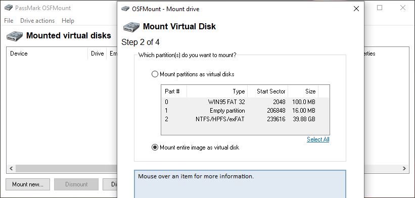 Da OFSMount, Mount new e montiamo il Disco VMDK della VM appena creata, Montiamo l’intero Disco, procediamo di Default: