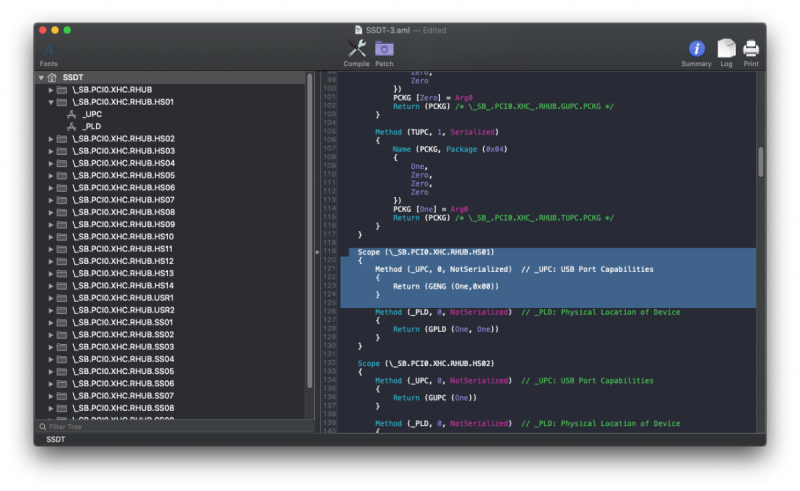 Non va bene Perchè modifichi _PLD? quello non va toccato, te l'ho detto anche prima Rimettilo come era devi modificare così sempre e solo in _UPC Scope (\_SB.PCI0.XHC.RHUB.HS02) { Method (_UPC, 0, NotSerialized) // _UPC: USB Port Capabilities { Return (GENG (One,0x00)) } Method (_PLD, 0, NotSerialized) // _PLD: Physical Location of Device { Return (GPLD (One, 0x02)) <--- NON qui } }