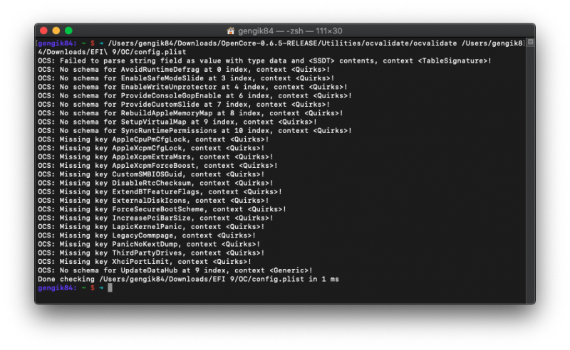 questo non ha errori per la 0.6.5 come struttura del config /Users/gengik84/Downloads/OpenCore-0.6.5-RELEASE/Utilities/ocvalidate/ocvalidate /Users/gengik84/Downloads/OpenCore-0.6.5-RELEASE/Docs/config.plist Done checking /Users/gengik84/Downloads/OpenCore-0.6.5-RELEASE/Docs/config.plist in 1 ms config.plist.zip