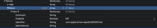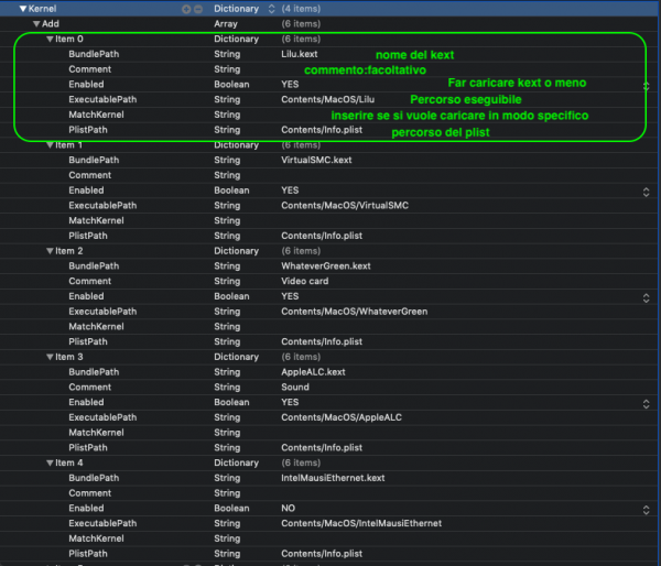 5. Kernel ADD: Qui ci vanno dichiarati i kext in uso nella EFI BundlePatch[/b]: "nome".kext Enabled: YES o NO per farlo caricare o meno ExecutablePatch: qui va indicato il percorso per l'eseguibile MatchKernel: questa funzione serve per diciarare versioni di osx specifiche dove il kext volete che sia caricato, è diciamo come clover quando si mette i kext in cartelle specifiche. Quale valore mettere? 18 indica Mojave.. antecendenti avranno 17 oppure 16 etc inserendo così il kext verrà caricato su tutte le build del relativo sistema operativo, per esempio da 10.14 a futura 10.14.6 (se fosse l'ultima) Se volessi scegliere una versione più definita di uno stesso macOS? bene.. per esempio attualmente l'ultima beta a oggi 10.14.5 beta 3 è 18.6 Come arrivare a questo? aprite il terminale e scrivete semplicemente [code]uname -r [/code] [/b]percorso a info.plist che nel 99% dei casi è sempre identico Block Quirks[/color] Qui troviamo alcune patch
