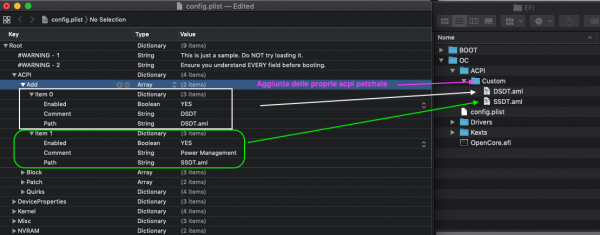 12. ACPI first step If you have to use patched ACPI it is mandatory to put them inside this folder: EFI/OC/ACPI/Custom Then you have to define and enabled it as pictures below Next we have to define and enable to load it Successivamente definite e abilitate per il caricamento Esempio nome convertito.png You can drop also in other way, you can use table OEM "name" Open it with maciasl app and check it strTohex.zip strTohex.zip strTohex.zip