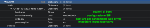 15. Ciao a tutti... Vi illustro alcune basi di questo bootloader. La struttura della EFI è questa EFI ├── BOOT │ └── BOOTx64.efi └── OC ├── ACPI ├── Drivers ├── Kexts ├── OpenCore.efi └── Config.plist Come vedete la EFI conterrà due Cartelle BOOT e OC ... diciamo identico a Clover che ha BOOT e CLOVER Dentro BOOT troviamo BOOTx64.efi che è appunto per il boot Dentro OC troviamo le rispettive cartelle: ACPI,Drivers,Kexts ACPI dove andranno messo le acpi patchate qualora si usassero Drivers: qui andranno messi i driver del bootloader. NOTA:non devono avere la nomenclatura x64 NON vanno messi i driver di clover salvo vBox in caso alla sostituzione di HFS.plus Driver base sono: AptioMemoryFix ApfsDriverLoader (qualora si usasse apfs, altrimenti si potrebbe omettere HFS.plus o vBox Kexts: qui vanno messi ovviamente i kext Iniziamo con il config, quindi apriamolo con un PlistEditor o chi c'è l'ha anche con Xcode