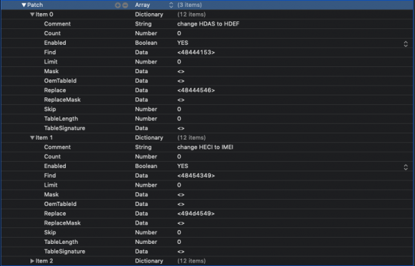 9. Device Properties 59[/color]120000 e FakeID 0x59128086 in Properties innanzi tutto va diciamo "invertito l'ordine delle coppie di numeri" omettendo 0x quindi ig-platform-id con Properties è AAPL,ig-platform-id 00 00 12 59 mentre per il FakeID si omette sempre 0x e anche 8086 sostituito da 0000 quindi sarà device-id 12 59 00 00 GFX0/IGPU[/b] PciRoot(0x0)/Pci(0x2,0x0) HDEF/HDAS PciRoot(0x0)/Pci(0x1f,0x3) oppure hardware datati PciRoot(0x0)/Pci(0x1b,0x0) esempio quando mettiamo layout 1 sul config, in Properties sarà quindi scriveremo 0c LayoutConverter.zip