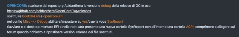 guarda sinceramente diciamo come al "classico" in generale per far funzionare la batteria, a quest'ora già doveva funzionare poi guardai anche una configurazione che allegasti e anche qui SSDT relativo era ok ma comunque la batteria non funzionava no penso che a ora ci siano altre cose da modificare ma ancora sinceramente non ho ben capito proprio perchè doveva già funzionarti nella prova di ieri avevo fatto aggiunte a riguardo, purtroppo il boot non va creando un problema al trackpad a cui non ho minimamente messo le mani credo che dipenda in questo caso più dal discorso che le acpi le hai estratte da clover e con probabilità qualcosa non combacia a riguardo per opencore Non riesco a lavorarci in modo continuativo su questo sono sincero per via di impegni e alcune beghe però se riesci a postarmi le acpi pulite estratte da opencore, continuo a lavorarci via via e ti faccio riprovare... Purtroppo anche qui non abbiamo avuto fortuna almeno per ora per il problema ormai noto che nel dump ci sono ssdt che non dovrebbero quindi è tutto falsato Riesci a creare una EFI minimale? senza nulla, quindi nessuna patch acpi e nessun SSDT veramente minimale, non importa che faccia il boot, basta che tu arrivi alla gui di opencore e il dump è già eseguito Per esempio potresti anche prendere la configurazione di ieri col DSDT anche se non avvia, disattivi il dsdt sul config, sostituisci i file Bootx64 e opencore.efi, abiliti SysDump sul config e poi posti nuovamente le acpi pulite -