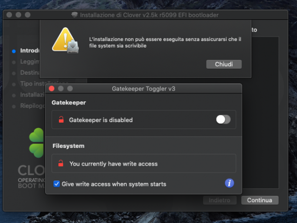 Buongiorno a tutti, non riesco ad aggiornare Clover lanciando il programma, ma devo montare la EFI ed estrarre i file che servono. Per carita' niente di che, ma non capisco perche' in genere agli altri funziona..! Ho provato con terminale a montare il filesystem in rw , ma senza successo. Pensando di sbagliare il comando ho provato il tool Gatekeeper Toggler v3 e anche con lui non funziona. ( o meglio.... dice che e' in rw, ma clover non aggiorna)) Qualche idea del perche' ? Il comando e' sbagliato? sudo mount -uw / Mi restituisce questo errore: mount_apfs: volume could not be mounted: Operation not permitted mount: / failed with 77 Grazie.!