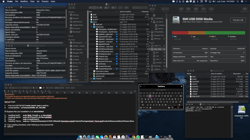 Perfetto, avevo visto dei Crucial ed un più veloce Silicon Power tutti da 1Tb, ho pensato al più blasonato Samsung ma andrò a guardare i "vostri" Sì, questo l'ho capito, lo dicevo come eventualità qualora decidessi di cambiare qualcosa all'interno che vada a coinvolgere le USB. A me non interessa fare per forza con OC, parlavo di lui perchè prima di leggerti avevo capito che in futuro solo OC avrebbe potuto avviare Big Sur. Se posso fare con Clover, a parità di bisogno di studio/lavoro a parte, tanto meglio. Anche perchè con OC dovrei partire proprio da sottozero. Ok. Leggo, studio e mi preparo a romperti le scatole OK, l'immagine che ho messo contiene una visione d'insieme, ma per non fare io casino mi potresti aiutare ? Le istruzioni per installare chameleon sono queste: 1 First of all COPY&PASTE boot0, boot1h, boot to partition. 2 Locate partition: cd /Volumes/NAME_OF_VOLUME !!! Suppose that your installation is on /dev/disk0s2 3 Installing boot0: sudo fdisk -f boot0 -u -y /dev/rdisk0 4* Installing boot1h: sudo dd if=boot1h of=/dev/rdisk0s2 5 Clean up: sudo rm boot0 boot1h 6* Installing Theme: sudo cp -r /Volumes/Chameleon\ 2\ RC5\ VS/Install\ Chameleon.mpkg/Contents/Packages/Install_Theme.pkg/Contents/Resources/Extra/Themes /Extra 4* - if you installing chameleon under Fat32 fs you must use boot1f32 6* - optional Il disco dove ho fatto il restore (una USB 128Gb) è disk7, la partizione EFI è disk7s1. Come devo "adattare" i comandi? E' giusto che la partizione EFI sia visibile senza bisogno di montarla? Se no, come la nascondo? -