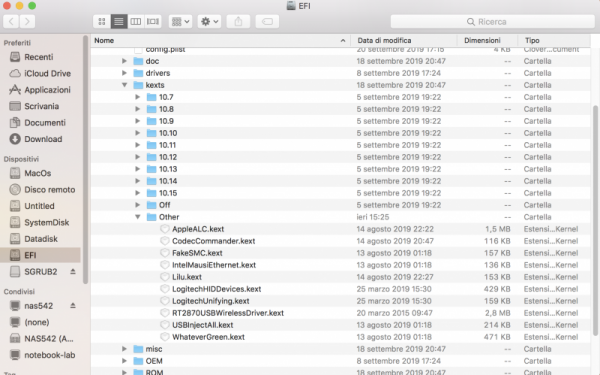 Chiedo scusa, mi sono accorto che il comando sopra l'ho digitato male. Il risultato è Leles-iMac:~ lele$ sudo kextstat | grep -v com.apple Index Refs Address Size Wired Name (Version) UUID <Linked Against> 35 2 0xffffff7f911ec000 0x22000 0x22000 as.vit9696.Lilu (1.3.8) FC38993B-FBDB-3E9A-AC3E-73704D26ACF6 <7 5 4 3 2 1> 36 0 0xffffff7f9120e000 0x66000 0x66000 as.vit9696.WhateverGreen (1.3.0) 2281A12E-A7C3-3968-BA4A-64D60CBA9AA6 <35 12 7 5 4 3 2 1> 39 0 0xffffff7f91274000 0x9000 0x9000 org.tw.CodecCommander (2.7.1) 114866EA-9E10-3A75-8084-CEEE9D344D9F <38 12 11 4 3 1> 40 0 0xffffff7f91284000 0x119000 0x119000 as.vit9696.AppleALC (1.4.0) 2009BAFC-6FB0-3304-B88E-94D2FCAE3E15 <35 12 7 5 4 3 2 1> 41 0 0xffffff7f9139d000 0x4000 0x4000 com.rehabman.driver.USBInjectAll (0.7.1) A5767EA0-3760-3131-B996-28EE85139CF5 <12 11 4 3> 42 0 0xffffff7f913a2000 0x1a000 0x1a000 org.netkas.driver.FakeSMC (1440) E55FB2CD-4A9D-3365-8668-1DA6A712DBA6 <11 7 5 4 3 1> 62 0 0xffffff7f913bc000 0x14000 0x14000 com.insanelymac.IntelMausiEthernet (2.4.0) 245D729F-7D48-3FD1-8D74-7B5D06F7C06E <16 12 5 4 3 1> 84 1 0xffffff7f80eb6000 0x47000 0x47000 com.Logitech.ControlCenter.HIDDriver (3.9.10) B0EDB2AD-688B-3446-910A-1BB6EEC12A21 <83 81 50 24 5 4 3> 85 0 0xffffff7f80f0d000 0x17000 0x17000 com.Logitech.Unifying.HIDDriver (3.9.9) 9DD96EF2-3F19-3DB2-9260-AFF735659C21 <84 80 63 50 5 4 3> di conseguenza vedo che il kext non viene caricato....cosa si può fare?