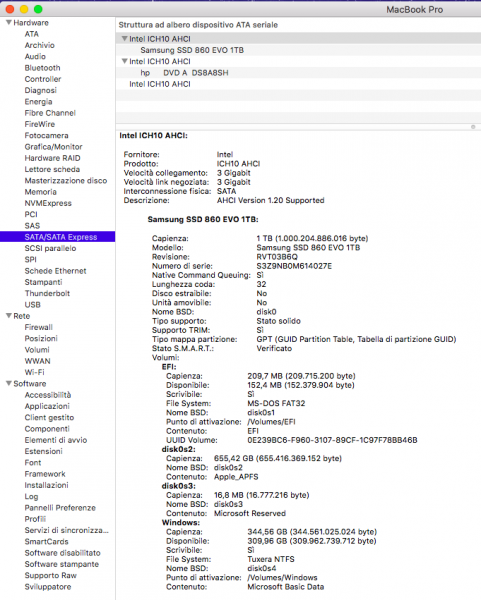 @iCanaro[/mention] Il Bios è un vecchio bios Phoenix con sfondo grigio e qualcosa in blue con scritte bianche e selezionabile da tastiera con frecce cursore, invio,- e +, insomma penso ci siamo capiti _whaa il comando del config che hai detto era già settato su auto=YES per il discorso dell'aggiornamento della patch di sicurezza considera il fatto che dopo averla scaricata si riavvia come se non ci fosse clover e ci fosse solo macos...fa finta di installer per un po' ma poi come se non trovasse dove installare si riavvia e ritorna alle scelte di clover senza nessuna icona aggiuntiva per l'udpate in corso... a fondo pagina trovate EFI e io reg dentro all'allegato ecco come è partizionato l'SSD da 1TB: screenshot0.png Notebook Santech N48.zip Notebook Santech N48.zip -