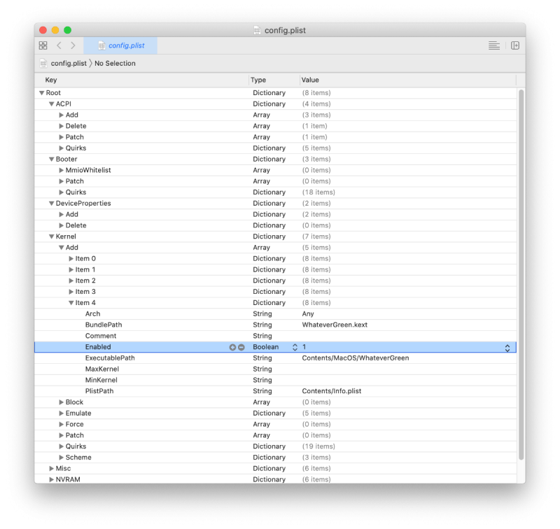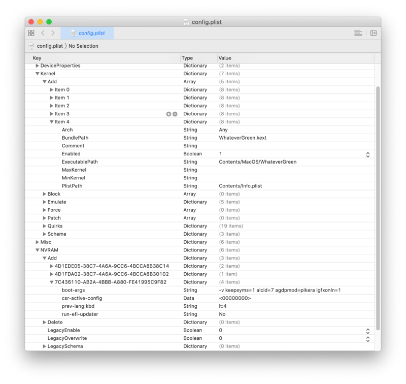 @Gengik84 Provate entrambe le bot-arg (agdpmod=vit9696 / agdpmod=ignore) smbios 19,2, con nessun risultato (Black Screen) Per rimuovere WEG lo faccio sia dalla cartella kext che dal config o basta specificare Enabled = 0 Quando tolgo WEG devo lasciare comunque qualche bot-arg? -