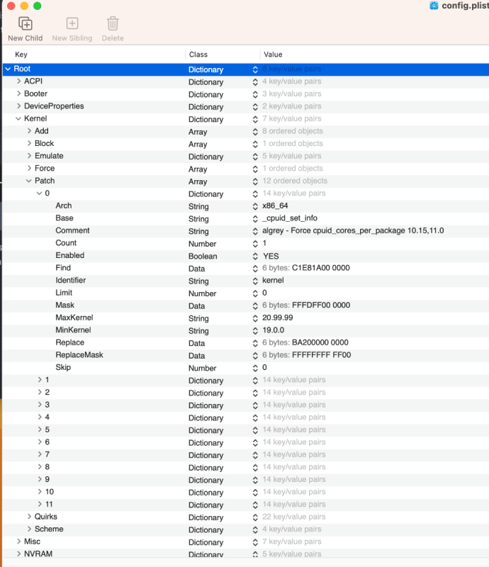 ce ne sono tre iniziali che vanno personalizzate sul numero dei cores le altre valide per tutti gli OSX la patch sta attraverso il parametro minKernel/maxKernel Es. 17.0.0 significa da High sierra se messo in min kernel 22.99.99 se messo in maxKernel significa sino a OSX Ventura quindi la patch se trovata nel kernel (Find/Replace) viene applicata in base all'OSX che hai dichiarato in quella parte https://github.com/macos86/AMD_Vanilla/tree/clover queste le gestisce macOS86.it se vuoi dare un'occhiata