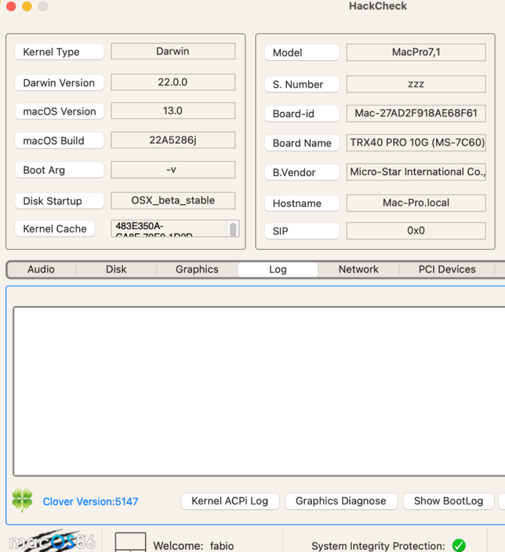0:110 0:000 GetDefaultModel()=MacPro6,1 0:111 0:001 Using config.plist at path: \EFI\CLOVER 0:112 0:000 There is a problem in plist '\EFI\CLOVER\config.plist' 0:112 0:000 Warning: invalid CustomUUID 'zzz' - should be in the format XXXXXXXX-XXXX-XXXX-XXXX-XXXXXXXXXXXX in dict '/SystemParameters/CustomUUID:1150' 0:112 0:000 Use CloverConfigPlistValidator or look in the log Chi usa clover potrebbe fornire un debug? @antunedduil warning nel debug ci sarebbe, non viene piu' mostrato Mi incuriosisce il GetDefaultModel...