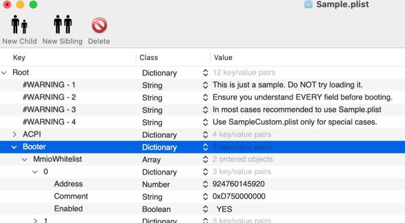 In questo thread proveremo a spiegare la funzione di questo interessantissimo quirk e soprattutto della correlata sezione di MMIO Whitelist che e' ancora piu' fondamentale per diversi sistemi. L'argomento e' stato documentato recentemente in modo piu' esaustivo nel pdf di configurazione di OpenCore, ma ha assunto al giorno d'oggi sempre piu' valore per avere un Hackintosh al massimo delle sue potenzialità anche alla luce delle nuove architetture di CPU in uso. Di base il quirk non e' attivo e per molti sistemi non e' indispensabile per far funzionare e partire il proprio Hack. A dicembre 2019 con l'uscita delle CPU AMD ThreadRipper della terza generazione (sTRX4), molti utenti, loro malgrado, sono stati costretti ad interessarsi al funzionamento del quirk in oggetto. In quel periodo la documentazione di OpenCore sull'argomento era poco esaustiva anche perche' era un quirk utile solo per vecchi sistemi. Con l'aiuto a volte criptico degli sviluppatori di OpenCore (ai quali e' sempre dovuto un ringraziamento per il loro lavoro) si sono iniziati a muovere i primi passi per capire come utilizzarlo per fare dei debug su una piattaforma come quella descritta poco sopra (sTRX4) in unione alla funzionalità della MMIO Whitelist. link Attivando il quirk e solo utilizzando una versione di debug di OpenCore con opzione Misc/Debug/Target impostato su 67, e' possibile, anche con una macchina che non parte, un debug nel quale sono evidenziate le aree MMIO del proprio PC (numero di aree e valori possono variare): 08:808 00:001 OCABC: MMIO devirt 0xE2100000 (0x81 pages, 0x8000000000000001) skip 0 08:809 00:001 OCABC: MMIO devirt 0xE3180000 (0x81 pages, 0x8000000000000001) skip 0 08:810 00:001 OCABC: MMIO devirt 0xEF100000 (0x181 pages, 0x8000000000000001) skip 0 08:811 00:001 OCABC: MMIO devirt 0xFA180000 (0x81 pages, 0x8000000000000001) skip 0 08:812 00:001 OCABC: MMIO devirt 0xFA300000 (0x100 pages, 0x8000000000000001) skip 0 08:813 00:001 OCABC: MMIO devirt 0xFEA00000 (0x100 pages, 0x8000000000000001) skip 0 08:814 00:001 OCABC: MMIO devirt 0xFEC00000 (0x1 pages, 0x8000000000000001) skip 0 08:816 00:001 OCABC: MMIO devirt 0xFEC10000 (0x1 pages, 0x8000000000000001) skip 0 08:817 00:001 OCABC: MMIO devirt 0xFED00000 (0x1 pages, 0x8000000000000001) skip 0 08:818 00:001 OCABC: MMIO devirt 0xFED40000 (0x5 pages, 0x8000000000000001) skip 0 08:819 00:001 OCABC: MMIO devirt 0xFED80000 (0x10 pages, 0x8000000000000001) skip 0 08:820 00:001 OCABC: MMIO devirt 0xFEDC2000 (0xE pages, 0x8000000000000001) skip 0 08:821 00:001 OCABC: MMIO devirt 0xFEDD4000 (0x2 pages, 0x8000000000000001) skip 0 08:822 00:001 OCABC: MMIO devirt 0xFEE00000 (0x100 pages, 0x8000000000000001) skip 0 08:823 00:001 OCABC: MMIO devirt 0xFF000000 (0x1000 pages, 0x8000000000000001) skip 0 08:825 00:001 OCABC: MMIO devirt 0x4040000000 (0x10400 pages, 0x8000000000000001) skip 0 08:826 00:001 OCABC: MMIO devirt 0x8BB0000000 (0x10400 pages, 0x8000000000000001) skip 0 08:827 00:001 OCABC: MMIO devirt 0x8BE0000000 (0x10400 pages, 0x8000000000000001) skip 0 08:828 00:001 OCABC: MMIO devirt 0xD750000000 (0x10400 pages, 0x8000000000000001) skip 0 E' di particolare importanza che queste aree possono essere diverse anche in condizioni di stesso BIOS e produttore, ma solo scambiando delle opzioni nel BIOS o riempendo gli slot nvme e pciexpress in maniera diversa. Nota: un errore comune e' prendere questa lista da una configurazione qualsiasi e inserirla nel proprio config.plist Va sempre necessariamente presa e calcolata nel sistema in uso e ricontrollata se si cambiano opzioni nel BIOS o si aggiunge hardware! Attivare il quirk comporta aver devirtualizzato le aree di memoria ed in alcuni casi liberati diversi megabyte di memoria (tipicamente dai 64 ai 256 Mb) fatto questo che consente ad alcuni sistemi problematici di partire senza avere il famigerato errore al boot (memory allocation errors), e questo proprio nelle fasi iniziali del boot. skip 0 significa area devirtualizzata e nel caso durante le sue operazioni interne macOS necessitasse di quell'area, non avendola a sua disposizione, si creerebbero mal funzionamenti o Kernel Panic. Su indicazioni dei devs di Opencore ci si e' concentrati sulle ultime 4 aree che sono quelle piu' corpose a livello di pagine da eventualmente devirtualizzare e con 16 combinazioni (4!) si stabili' che le patches del Kernel in uso allora erano malfunzionanti per i sistemi sTRX4. Trascuriamo ora questa affermazione rivelatasi poi non propriamente corretta, ma allora era praticamente un dato di fatto che porto' molti utenti sTRX4 con desiderio di utilizzare OSX sulle proprie macchine ad esplorare l'affascinante mondo della virtualizzazione con ProXmox. Ora le prove fatte all'epoca furono di riportare le ultime 4 aree a completo utilizzo di OSX (skip 1) in varie combinazioni (16). Come? Aggiungendo queste aree nella sezione Booter/MmioWhitelist del nostro config.plist. Per fare questo ci viene in aiuto la calcolatrice scientifica o la ottima app presente in area download HackCheck (visibile in foto) per il download clicca qui: https://www.macos86.it/files/file/95-hack-check/ ora concentriamoci solo sull'area: 08:828 00:001 OCABC: MMIO devirt 0xD750000000 (0x10400 pages, 0x8000000000000001) skip 0 e prendiamo il valore esadecimale 0xD750000000, questo andrà convertito in numero come da figura qui sotto: e andrà riportato precisamente nella apposita area del config.plist attivandolo: Dopo aver salvato il config.plist e riavviato avremo nel nostro successivo debug log questa situazione: 08:808 00:001 OCABC: MMIO devirt 0xE2100000 (0x81 pages, 0x8000000000000001) skip 0 08:809 00:001 OCABC: MMIO devirt 0xE3180000 (0x81 pages, 0x8000000000000001) skip 0 08:810 00:001 OCABC: MMIO devirt 0xEF100000 (0x181 pages, 0x8000000000000001) skip 0 08:811 00:001 OCABC: MMIO devirt 0xFA180000 (0x81 pages, 0x8000000000000001) skip 0 08:812 00:001 OCABC: MMIO devirt 0xFA300000 (0x100 pages, 0x8000000000000001) skip 0 08:813 00:001 OCABC: MMIO 
