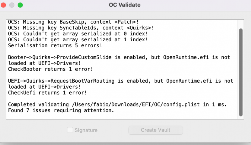 e queste sono le cose importanti da iniziare a correggere come ti suggerisce OCAT io poi snellirei parecchio la tua sezione Kext in quanto non e' tutto necessario quello che hai ora per installare le patches del kernel sono correttamente aggiornate per la tua CPU come i vari quirks
