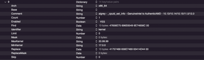 For Opencore users: I have not tested this new and shining set of patches , I will do later I see they left some not useful patch as the "leaf"one we demonstrated here we can skip (trx40, x570, x370 chipset) Same typo as: For Clover users: for now I will stay with this set: it misses in my case HighSierra boot in clover bootloader, all others newer system from Mojave are fine IT WORKS! 🙂