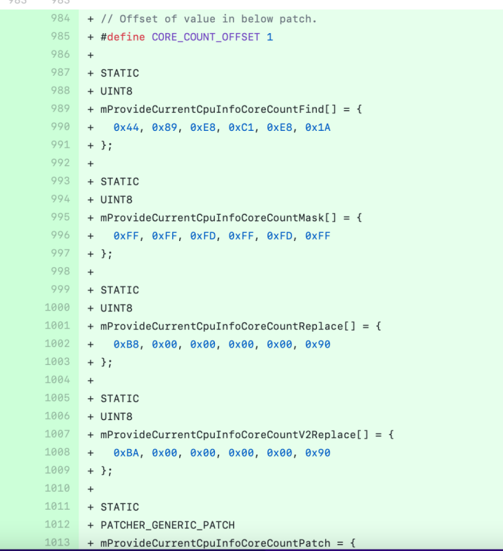 4. new patch algrey - Force cpuid_cores_per_package: Below I hope an useful schema taken from Shaneee Opencore PR COMMENT: algrey - Force cpuid_cores_per_package FIND: c1 e8 1a 00 00 00 MASK : FF FD FF 00 00 00 BASE: _cpuid_set_info COUNT: 1 REPLACE high sierra to mojave: b8 XX 00 00 00 00 REPLACE from catalina to big sur : ba XX 00 00 00 00 REPLACE MASK high sierra to big sur : FF FF FF FF FF 00 REPLACE monterey : ba XX 00 00 00 90 REPLACE MASK monterey : FF FF FF FF FF FF 3970x --->32 cores XX=20 3960x--->24 cores XX=18 3950x--->18 cores XX=10 and so on 🙂 so for all system from high Sierra you have three different patches (common find and mask) different replace and replace mask minKernel and maxKernel do the jobs to enable proper ones for OS you use I am using an old patch posted on @jsl2000config.plist which works in BIG SUR and all Monterey Beta But latest PR uses above patching 😉