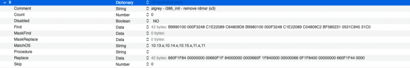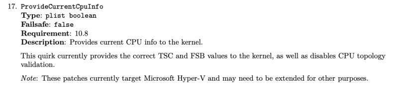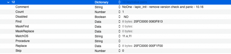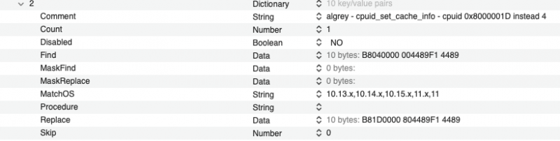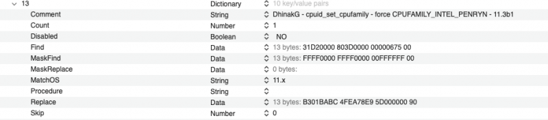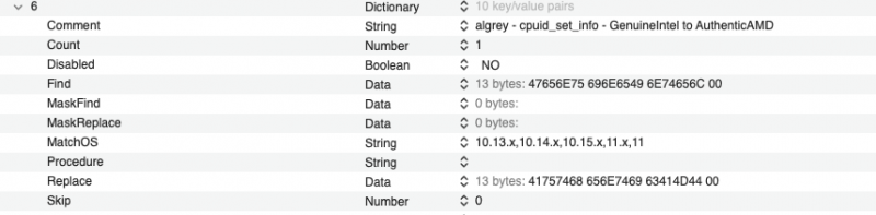 Clover Patches useful to boot with Big Sur 11.4,11.5 beta 5, 12.x (x=1 and 2) ๐ Opencore Patches useful to boot with Big Sur 11.4,11.5 beta 5, 12.x (x=1 and 2) list of patches I use in above pictures: new_Algrey Force cpuid_cores_per_package (unreleased in latest form tested today, you can use patch available for now) _cpuid_set_cpufamily - Force CPUFAMILY_INTEL_PENRYN (unreleased) Goldfish64 - Bypass GenuineIntel check panic - 12.0 algrey - _commpage_populate - Remove rdmsr - 10.13/10.14/10.15/11.0/12.0 algrey - _cpuid_set_cache_info - Set cpuid to 0x8000001D instead 4 - 10.13/10.14/10.15/11.0/12.0 algrey - _cpuid_set_generic_info - Remove wrmsr - 10.13/10.14/10.15/11.0/12.0 algrey - _cpuid_set_generic_info - Set flag=1 - 10.13/10.14/10.15/11.0/12.0 algrey - Remove Penryn check to execute default case - 10.13/10.15/11.0/12.0 algrey - Get DID and VID from MSR - 10.13/10.14/10.15/11.0/12.0 algrey - _cpuid_set_info - GenuineIntel to AuthenticAMD - 10.13/10.14/10.15/11.0/12.0 algrey - _i386_init - Remove rdmsr (x3) - 10.13/10.14/10.15/11.0/12.0 XLNC - Remove version check and panic - 10.15/11.0/12.0 this patches: algrey - Remove Penryn check to execute default case - 10.13/10.15/11.0/12.0 algrey - Get DID and VID from MSR - 10.13/10.14/10.15/11.0/12.0 they are not useful if you use a bootloader with ProvideCurrentCpuInfo quirk capability. Personally, my goal was reached by now! always thank to @algrey for his time and skill! ๐ UPDATE 17-07-2021: