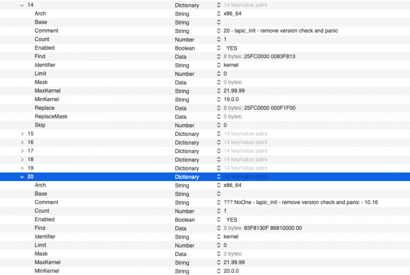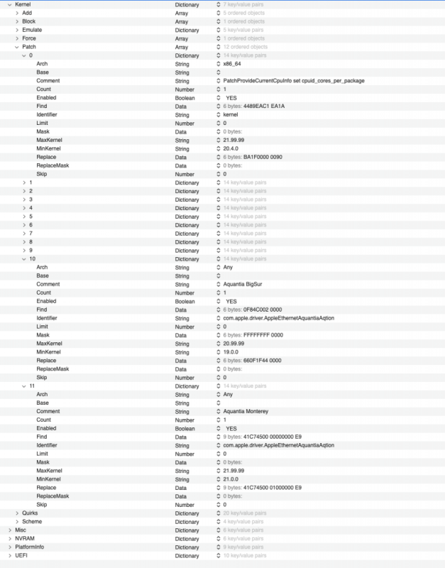 Attached patches for 11.4,11.5b4 and 12 b1 One patch is needed to install and boot Monterey Beta 2 and for now it is not public. thanks to Algrey for patch 0 which allows to bypass many of previous and mandatory patches patch 0 that algrey posted on Insanely Mac is made for my processor in this example it is very easy to recreate it for other types of cpu: PatchProvideCurrentCpuInfo set cpuid_cores_per_package f:4489EAC1 EA1A r:BA1F0000 0090 PAY ATTENTION Value 1F means 31, 3970 x has 32 cores so as stated by @algrey on IM 32 -1=31=1F IE for a 8 cores CPU : 8-1=7=07 for 3950x or 5950x 16: 16-1=15=0F and so on Patch # 1 will be released when the editors of the patches will decide to make it public! Thanks again @algrey for his usual availability and skill in this plist latest two are for Aquantia Ethernet UPDATE 17-07-2021: