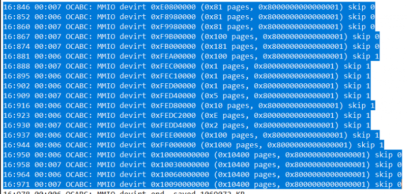 if you see this is changed 15:936 00:005 OCABC: MMIO devirt 0xC0600000 (0x81 pages, 0x8000000000000001) skip 0 Now it is late for me.. try if you can to change first MMIO with this value: 3227516928 otherwise i will help you tomorrow 🙂 You have to change in config first MMIO with value i calculated above in log then you should see skip 1 instead 0 leave 4g on and delete npci=0x2000
