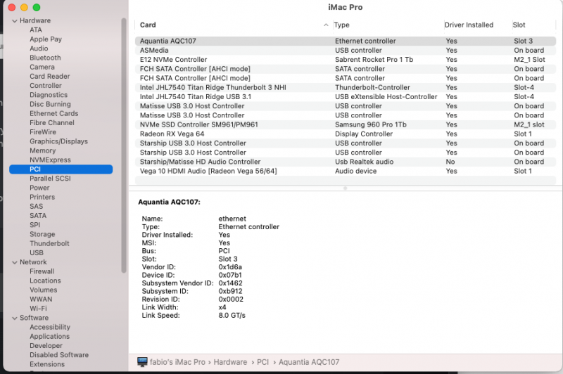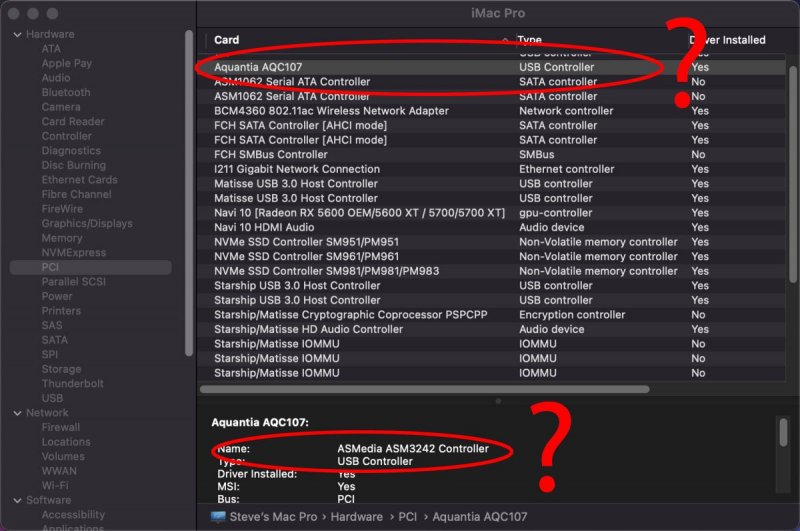 BRavo maybe to much stuff but you have understood well 🙂 if you want..could explain how to do for others? 😉 ASM1062 Sata is not loaded..have you tried to use some kext? like AHCPIunsupported.kext or similar for ASMEDIA SATA controllers? I think some errors there..Aquantia should be an ethernet card..but..ei maybe I am wrong and you are learning by now 🙂 🙂