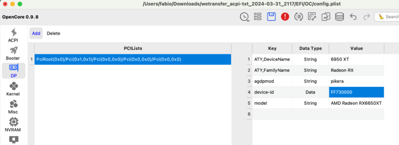 Benvenuto Angelo che sistema operativo stai usando? quella scheda e' supportata solo in Monterey su Mac Pro 4.1/5.1 (io ho una 6600 liscia) Per il config.plist puoi usare diversi modi con Interfaccia grafica: Ocat senza interfaccia grafica Plist edit pro (anche in versione demo) ce ne sono molti altri