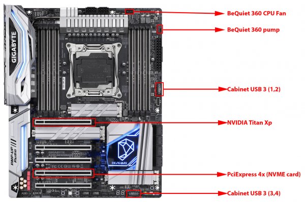 IMPORTANT Update Added here USB port mapping: https://www.macos86.it/viewtopic.php?p=13032#p13032 X299 Gigabyte Ex (rev.1.0) used in this article is simple to configure in a basic way to have a working Hackintosh. Follow this thread to have a fantastic a "powerful Hackintosh ever" © Steve! 🙂 One big difference you can find here from others guide you can find in the net is I use CSM enabled/disabled . boths setup are fine I have choosen Gigabyte X299 motherboard because, Gigabyte is the only manufacture which gives support to RDIMM ECC (Registered Dimm ECC) disabling ECC as mandatory for Skylake X CPU intel specs With X99 instead was possible to have an Extreme or Xeon CPU and using ram without problem (ECC or not) With new Intel CPU Xeon and Extreme CPu need of a different CPU socket to work Till F3 bios, Gigabyte supports DDR4 not supported by Intel definition and I would like also to know if it is possible to break 128 Gb limit with these motherboards (all gigabyte X299) as stated in Extreme Intel ark specs. I have decided to start my rig always with clover boot loader , if I need to enter in Windows I press exit in boot clover menu and Windows Start For this task it is important to have right order in harddrive priorities in Bios GPT conversion adds an EFI partition on Windows drive which is visible in boot clover menu and, if selected it starts windows This guide does not talk about thunderbolt setup because I have any TB drives or similar. Prerequisites: A working Hackintosh/Mac or a virtual machine with OSX installed Software: OS: macOS High Sierra 10.13.4 (17E199) https://itunes.apple.com/us/app/macos-high-sierra/id1246284741?mt=12 installation utility: https://www.macos86.it/MacOS86_Downloads/?path=Applicazioni/Creazione%20USB%20per%20installare clover boot loader (I have used R4369) https://sourceforge.net/projects/clover ... p/download">https://sourceforge.net/projects/cloverefiboot/files/Installer/Clover_v2.4k_r4369.zip/download Clover Configurator app (Global Edition) https://mackie100projects.altervista.org/download/ccg/ Hardware: case: Thermaltake Core X9 [/i]Philips Monitor, 27'' [/i] LG 43UD79 [/i] Enermax 1700w epm1700egt motherboard.png CPU: Intel I9 7980 Xe bequiet 360.jpg Memory: 2x 64 Gb Kingston RDIMM ECC (128 Gb) star-wars-jedi-order-nvidia-titan-xp-collectors-edition-u.jpg NVME DIsk: Samsung 960 Pro 1 Tb (installed on PCIEXPRESS card) 850 pro 512 gb.jpg SSD2: Intel 80 Gb seagate 4tb.jpg HDD3: Seagate Surveillance HDD SkyHawk 6TB HDD4: Seagate Surveillance HDD SkyHawk 6TB pioneer.jpg mouse and keyboard: Generic USB type Peripherical positions on motherboard: sata slot.jpg Backplate connections:
