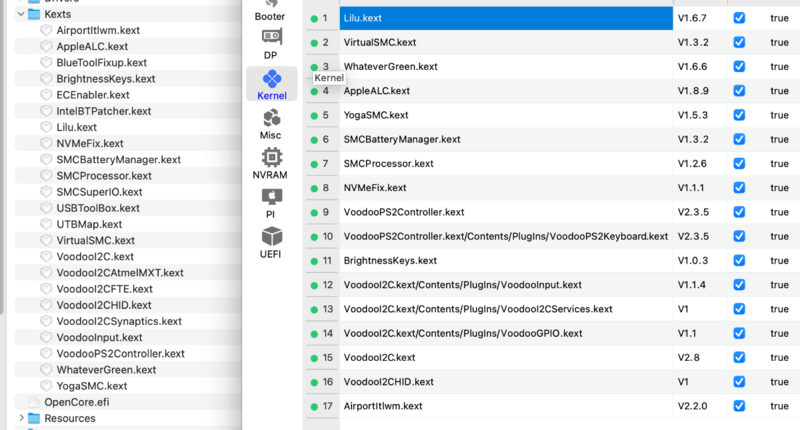 devi dichiarare i kext che ti sono stati suggeriti e che hai al momento solo copiato nella cartella Kext di OC messi li non sono utilizzati se non li dichiari come vedi per gli altri nella parte di destra della immagine
