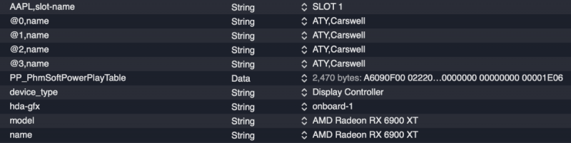 No. It is specific for each model: Radeon 6900 -> ATY,Carswell Radeon 6800 -> ATY,Belknap Radeon 6600 -> ATY,Henbury Radeon 5700 -> ATY,Adder Radeon 5500 -> ATY,Python For example, the 6900 example by fabiosun is changed from ATY,Carswell to ATY,Henbury for the 6600 model. Also, people are again playing with "PP_PhmSoftPowerPlayTable" (aka sPPT) to restore GPU metrics, also injecting via DeviceProperties. (I wrote about this early on in this thread for the Radeon VII to boost speed. The value is specific for each model.) One such thread is here. The value I use for my 6900XT (Powercolor Red Devil) sPPT: A6090F00 022203AF 09000077 40000080 00180000 001C0000 00000000 76000000 00000000 00000000 00000100 00000100 00000D00 0000640A 0000B004 0000E803 00009407 0000F204 0000C505 0000F204 0000C505 0000B004 0000C104 0000C104 00002A03 0000C104 00000000 00000000 00000000 0000F401 0000E001 00006100 00002602 00003D01 00006B01 00003D01 00006B01 0000A201 0000E701 0000E701 00002C01 0000E701 00000000 00000000 00000000 00008100 00001000 00001E00 00000101 01010101 01010101 01010101 00010000 00000000 00000000 00000000 0000B80B 0000B80B 00000000 00000000 00000000 0000B80B 00003304 00003304 00000F00 0000E40C 0000E40C 00006400 00006E00 00000100 00000100 00000100 00000100 00000100 00006400 00006400 00006400 00006400 00006400 00006400 00006400 00006400 00006400 00006400 00000000 00000100 00000000 00000000 00000000 00000000 00000000 00000000 00000000 00000000 00000000 00000000 00000000 00000000 00000000 00000000 00000000 00000000 00000000 00000000 00000000 00000000 00000000 00000000 00000000 00000000 00000000 00000000 00000000 00000000 00000000 00000000 00000000 00000000 00000000 00000000 0000F401 0000F401 00000000 00000000 00000000 0000F401 0000A202 0000A202 00000A00 0000FA00 0000E803 00001900 00003200 00000000 00000000 00000000 00000000 00000000 00001900 00000A00 00001900 00000A00 00001900 00000A00 00001900 00000A00 00001900 00000A00 00000000 00000000 00000000 00000000 00000000 00000000 00000000 00000000 00000000 00000000 00000000 00000000 00000000 00000000 00000000 00000000 00000000 00000000 00000000 00000000 00000000 00000000 00000000 00000000 00000000 00000000 00000000 00000000 00000000 00000000 00000000 00000000 00000000 00000000 00000000 00000000 00000600 00000600 06005700 5A005F00 5A00E803 B004D606 0807D007 D007CA08 CA080000 00000000 00000000 00000000 00000000 00000000 00000000 00000000 00000600 0000FFFD 7FA36337 0000FF00 00000000 00000000 00000000 0000FF00 00000000 00000000 00000000 00004001 37000000 00006400 6E006400 73007300 73007300 00000000 00000000 00000100 00000A00 00000000 00000000 00000000 00000000 00000000 00000000 0000FE38 0000730F 00006400 64001C0C 800C0000 00000000 0000E40C E40C5C12 F8114000 00013200 3C00800C 800C800C 800C1400 14000000 02000000 803F0000 0000B537 B83EEF1B 67BF4F40 A73F8B04 00000000 0200EE7C 8F3FA69B 843E4434 9A3E43AD 09BE3D0F 363FF100 00000001 0400CDCC AC3FE3A5 9BBD6F81 E43ECAA6 CCBE0421 493FC001 00000000 02000000 803F0000 000072C4 7A3E4C89 84BEDCBA 433F1102 00000000 0200098A AF3F295C 0FBD85CE EB3E10CC C1BE4720 463F9B01 00000000 02006ADE 893FB81E 053E8E75 913E2849 57BEE42C 3C3F7301 00000000 0200098A AF3F295C 0FBD85CE EB3E10CC C1BE4720 463F9B01 00000000 02006ADE 893FB81E 053E8E75 913E2849 57BEE42C 3C3F7301 00000000 02007D3F 953FDD24 063E1D77 AA3EEE77 68BEC91F 3C3F5501 00000000 02006ABC 743FAE47 613E732E 653E52ED 13BED72F 383F4301 00000000 02006ABC 743FAE47 613E732E 653E52ED 13BED72F 383F4301 00000000 02000E2D 123F9A99 D93E2783 A33D8D28 EDBCE7E3 323FB600 00000000 02006ABC 743FAE47 613E732E 653E52ED 13BED72F 383F4301 0000F401 640A0000 00000000 00000000 00000000 00000000 00000000 00000000 00006B01 C5050000 00000000 00000000 00003D01 F2040000 00000000 00000000 0000E001 B0040000 00000000 00000000 00006100 C901A202 E803A201 B0040000 00000000 00000000 0000E701 C1040000 00000000 00000000 0000E701 C1040000 00000000 00000000 00002C01 2A030000 00000000 00000000 0000E701 C1040000 00000000 00000000 00002602 94070000 00000000 00000000 00000000 00000000 00000000 00000000 00000000 00000000 00000000 00000000 00000000 00000000 00000000 00000000 00000000 00000000 00000000 00000000 0000640A 0000B004 0000E803 00009407 0000F204 0000C505 0000F204 0000C505 0000B004 0000C104 0000C104 00002A03 0000C104 00000002 03037805 00004C01 FA01F00A 800C8C0A 800C480D 480D8813 18151815 1815F401 2003F401 01000102 5D000100 00000000 00000000 00000000 00000000 00000000 00000000 00000000 00000000 00000000 00000000 00000000 00000000 00000000 00000000 00002A16 D7158415 3015DD14 8A143614 E3139013 3D13E912 9612B111 CC10E70F 020F0000 00000302 01000000 00000000 00000000 00000003 01063601 6B023700 46009001 90019001 90019001 90019001 90019001 90011E00 E803D007 B80B0000 5A00F401 00000100 01020000 00000000 00000000 01000000 00000000 00000000 00000000 00000000 00000000 00000D54 863DBC05 D2BD1F80 143E0000 00000000 00000000 00000000 00000000 00000000 00000000 00000000 00000000 00000000 00009A99 993E0000 C03F3333 13400000 20406666 46400AD7 233DDD24 863DA245 B63D39B4 C83DC74B B73E7593 983D2FDD 84BEA392 7A3EE561 21BD0456 8E3EC572 2BBEC000 C0000101 00000000 0000C000 C0001900 19000000 00000000 00000000 00000000 00000000 00000000 00000000 00000000 00000000 00000000 00000000 00000000 00000000 00000000 00000001 3B0B4501 00003480 373B9FAB CD3EED0D 3E3C7593 F83E0000 01000000 00000000 00000000 00000000 00000000 00000000 00000000 00000000 00000000 00000000 00000000 00000000 00000000 00000000 00000000 00000000 00000000 00000000 00000000 00000000 00000000 00000000 00000000 00000000 00000000 00000000 00000000 00000000 00000000 00000000 00000000 00000000 00000000 00000000 00000000 00000000 00000000 00000000 00000000 00000000 00000000 00000000 00000000 00000000 00000000 00000000 00000000 00000000 00000000 00000000 00000000 00000000 00000000 00000000 00000000 00000000 00000000 00000000 00010000 00000000 00000000 00000000 00000000 00000000 00000000 00000000 00000000 00000000 00000000 00000000 00000000 00000000 00000000 00000000 00000000 00000000 0000000