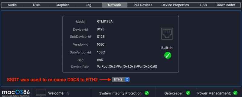 I'm just getting back onto the forum after a hiatus (many reasons...). Due to a "gut feeling" I stopped using Monterey betas a few months ago and settled on the official releases. The one I've been running is 12.2.1. I've been heavily using the TRX40 for many tasks and for the most part, there have been no issues. However, on reading recent posts on this thread, there seem to be many issues with the Aquantia and I211 ports, especially with the latest Monterey beta releases. As a means of skirting the problem, I decided to try an AIC. Of the many I've tried (and those failed), this one (here) works well and it's not expensive (< 30 USD). It should allow speeds up to 2.5 Gb (my network is only 1 Gb). Until the latest Aquantia-Marvell 10Gb AQN113 AICs are available (the AQN113 is used on the latest M2 Macs and should work OOTB), I think this AIC may be a good interim substitute. This AIC does require a special kext file: Mieze's kext (LucyRTL8125Ethernet). This can be downloaded via the Kext Updater app or on the InsanelyMac site (here; which also has a discussion about the RTL8125), but to save time I've added the version I downloaded last night as an attachment. Do note that I've only tested on 12.2.1, so I don't know if there will be an issue on the more recent betas, but since it's dependent on a current kext file, i rather think it will still be functional. In the next couple of days, I take a spare drive and update it to the latest beta to further test. Hackintool and Network Utility: And with HackCheck: In case anyone is interested, I'll attach the SSDT used to re-name the D0C8 device to ETH2. But this SSDT will probably need adjustment of the device based on your mobo, which should be a trivial task using IORE. LucyRTL8125Ethernet.kext.zip SSDT-TRX40-Realtek-RTL8125A.aml.zip