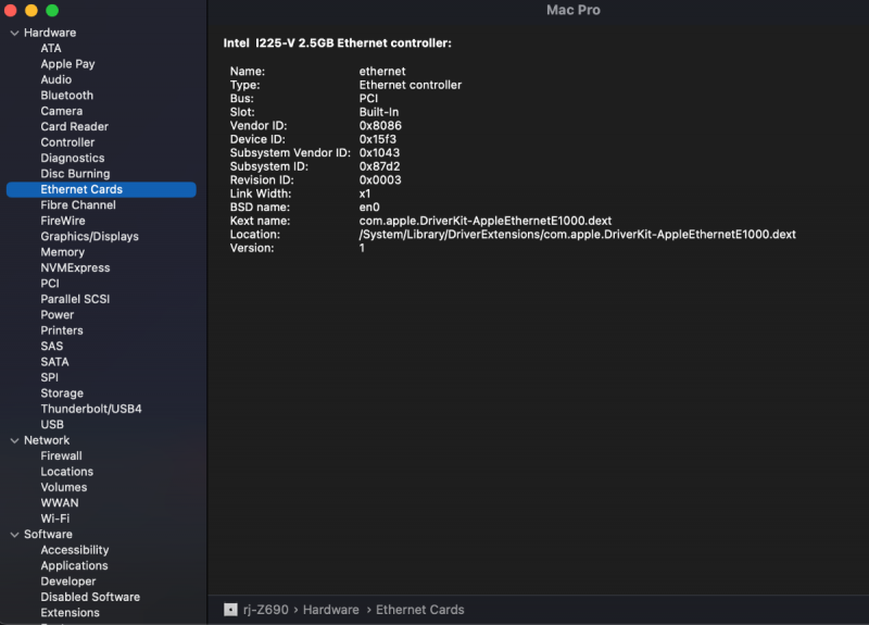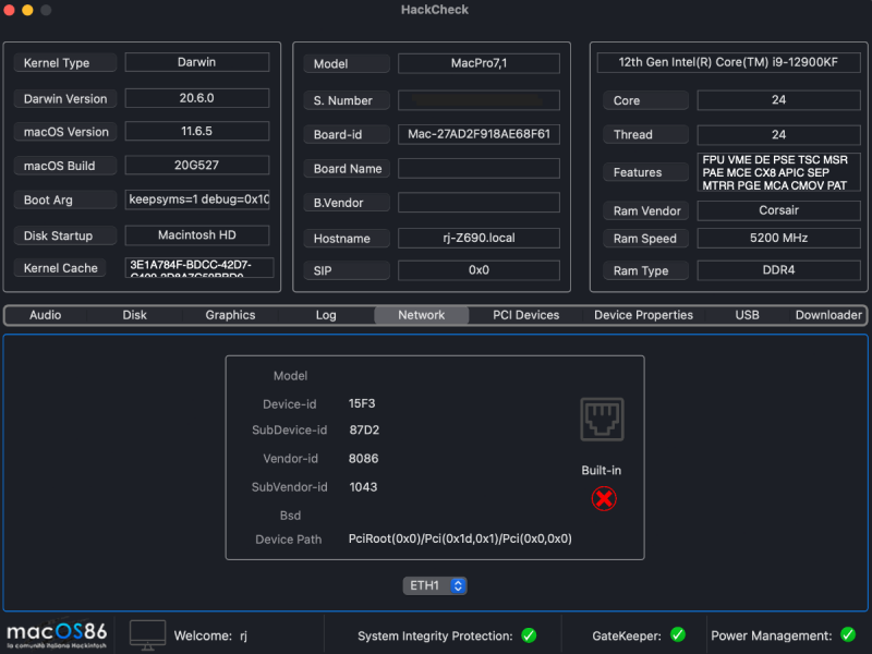 I'm using HackCheck v1.0.2 (1/25/21 release). There seems to be a problem with identifying an I225V network connection in Big Sur on a Z690 mobo. This is a Z690 build (not my usual Threadripper), using OC v080. The mobo is an ASUS Z690 ROG Maximus Extreme with an i9 12900KF CPU (I was given a binned chip and could not resist using it on a new build; the multicore speed is ~same as our Threadrippers, but the single core is faster). With the Z690, the Aquantia AQC113C does not work (this port does work in Monterey; it properly has a red X in Big Sur). Meanwhile, the I225V port works in both Big Sur and Monterey (but not in older macOS like Mojave). The attached image is from Big Sur. From the red X, it implies that this port is inactive, but it is working as shown in the SysInfo window at bottom (and the fact that this is post is being made using the port as it is the only access to the internet). The data gathered about the I225V port is correct (device path, ID, etc). The red X for the I225V is present in Monterey as well as Big Sur, even though, again, the port is active. I was wondering if HackCheck needs updating for the newer mobos?