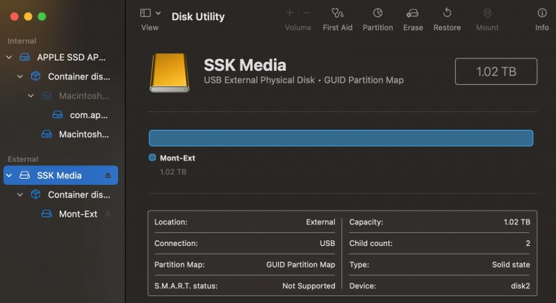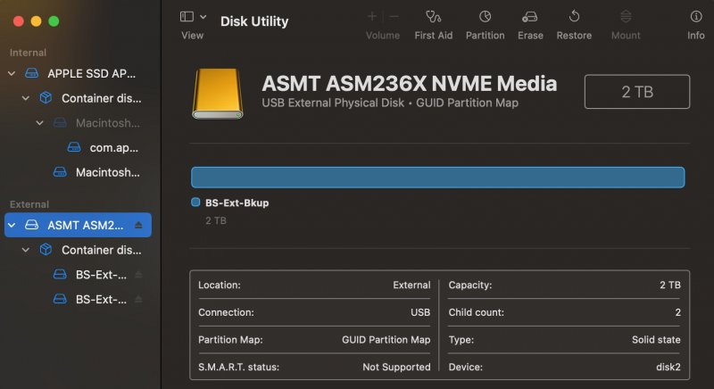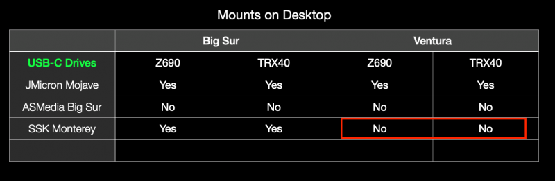 The USB-C mounting just got more confusing. I have a couple other USB-C drives, all by different companies and each with different macOSes on them. My initial tests were performed with the SSK Media drive that contains Monterey. It turns out that the different drives all behave differently between Big Sur and Ventura. The differences are summarized in the table below. There are differences between Big Sur vs Ventura but fortunately the Z690 and TRX40 mobos behave the same. So there are some differences with Ventura, as shown in red box above. The ASMedia drive is the odd one, since it won't mount on either platform in either OS (I now don't recall when I formatted it and installed Big Sur; maybe it was on a Z390 build). Based on these findings, I don't know which is affecting the mounting: a manufacturer's problem or the macOS on the drive problem. It seems that I'll need to format the bottom 2 drives (ASMedia and SSK) to see if, as empty drives, they will mount in Big Sur and Ventura. If they do mount then the macOS is affecting the mounting. BTW, all 3 drives mount on my real Mac laptop that is running Big Sur without any problems. The screen shots in Spoiler below were taken on the laptop. ***** Spoiler: drive manufacturer and macOS: