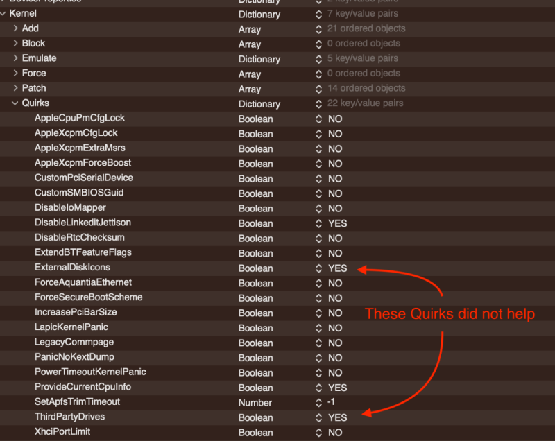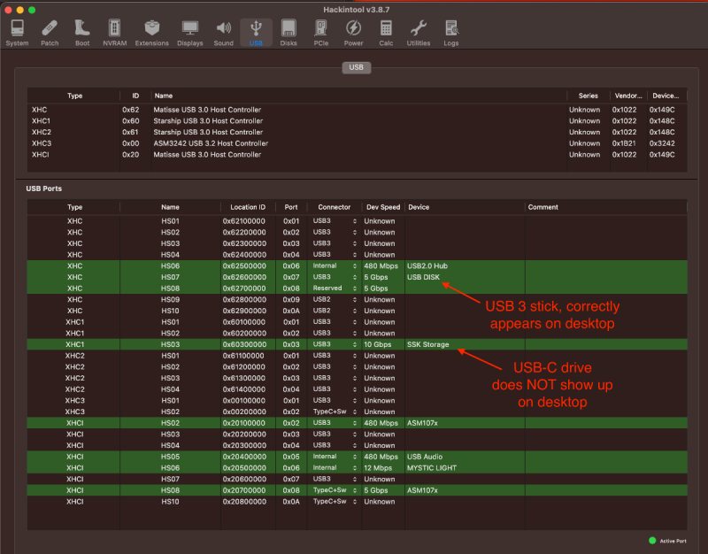 I've been having issues with USB-C drives not mounting (appearing) on the desktop under Ventura. There are zero problems with previous macOSes. See this post here and here for my initial comments. I posted on the InsanelyMac forum as I thought it was a Z690 issue but when testing on the TRX40, I had the same problem (again, only with Ventura). As shown below in the Hackintool USB section, the USB stick does appear on the desktop, while the external USB-C drive, whether I use a USB-C to USB-C or USB-C to USB-3 cable, does not appear on the desktop. Since the USB-C drive is shown as active within Hackintool (and I get the ejection error if I un-plug it), macOS Ventura is aware of the drive, but yet oddly, the drive does not appear on the desktop. It does not seem to matter which port I put the USB-C into, it does not appear on the desktop, while the USB3 stick does appear, when using the same port. While one response I got from someone on the InsanelyMac forum thought it was a USBMap kext problem, I tried different approaches and had the same result. Furthermore, no USBMap kext are even used on my TRX40 build as no USB device natively has more than 15 ports (therefore none are required). Adding the following Quirks did not help.