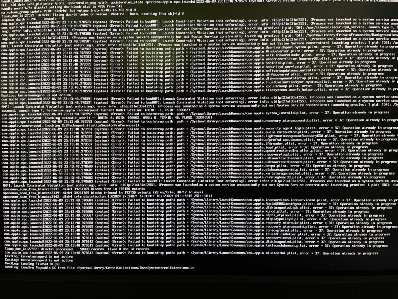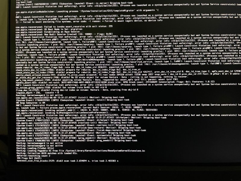 I've done all these things (aside from patches, same set up for Z690). I looked over your config file and we have the same Patches and Quirks. It continues to fail at about the same point (which is just before log-in; shown in Spoiler below). I'll try to re-install and if that fails, then I'll do a fresh install. Re-formatting and a fresh install did not help: things still got stuck at the final boot heading to login. More investigation... ***** Success! The key was adding AppleMCEReporterDisabler kext (which I noted in your config file, fabiosun; thanks!) and disconnecting the Aquantia port. The AppleMCEReporterDisabler kext file allowed me to boot Ventura, but it would crash before I could complete the sign-in. I thought perhaps an internet issue, so disconnected the Aquantia port and left the AIC ethernet, which I've described early in this thread (it uses the LucyRTL8125Ethernet kext file), connected. Attached is the config.plist file I used, less SNs. This config file boots late Big Sur, Monterey and Ventura beta 1. No custom ACPI or kext files are included. Of note is that I don't use WEG and instead inject DevProp for the GPU along with a customized ACPI file. Most of the kext files are for BT/Wifi turning on/off based on whether BS, Monterey or Ventura is being booted, providing good function including AirDrop. config-BS-Monterey-Ventura-public.plist.zip