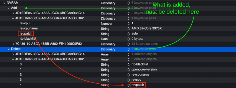 As I recall it had to do with the original DSDT files for each mono being a little different. The mobos with internal TB had that device declared in the DSDT and I tried to add similar declarations to out mobos but it didn't work. On another topic, when items are defined for RestrictEvents in the NVRAM section, the same items need to be Deleted. I'd over-looked that step and recently caught the resulting error. See image below. RestrictEvents works better when set up this way, deleting all items that were added.
