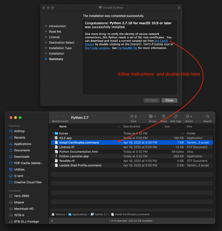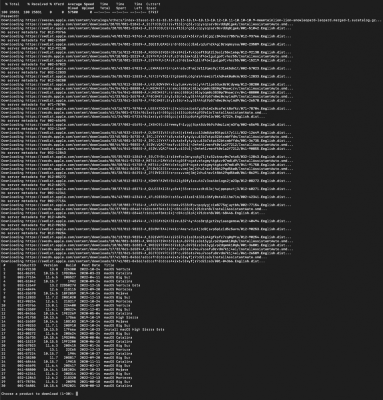 I realize this is an old post (and if I've missed the solution shown here and I'm repeating what is known, my apologies), but the problem posted has plagued me on Ventura on both the AMD and Intel platforms, until a couple of days ago when I stubbled across two steps to fix the problem. (While I do read this thread, I've been absent due to various family matters of life and death that fortunately resulted in life.) The fix shown below works for both AMD and Intel platforms. Anyhow, previous to Ventura, one could type the following (spoiler) and get a listing of macOS versions to download: In Ventura, you get the error as shown at the top of this post. The fix is to install python 2.7.x, which can be downloaded here (a copy is attached to this post). After installing, perform the certificate confirmation step: The certification will open Terminal and show this result: Next, open a new window in Terminal and enter "pip install xattr", which will return the following: Finally, you can now enter a modification of the old command (spoiler), which simply uses a new path to python: Once completed, you'll be shown the familiar macOS selection within Terminal (spoiler): python-2.7.18-macosx10.9.pkg.zip